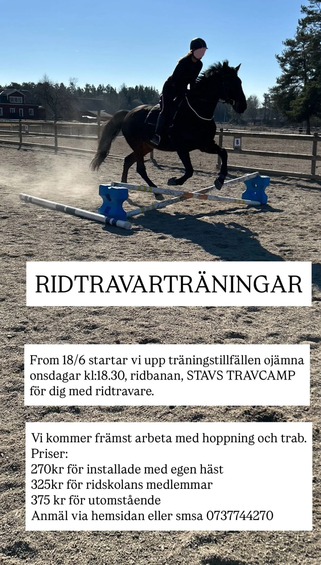Du innehar själv en försäkring för dig/din häst och deltar på eget ansvar. Hästen måste vara vaccinerad.